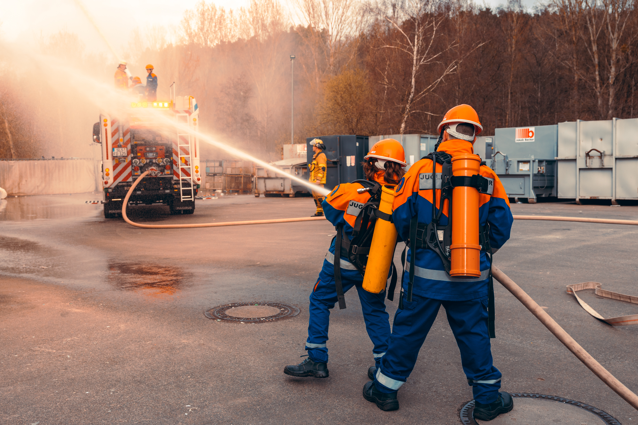 Unter den zahlreichen Zuschauern waren auch der Dillinger Bürgermeister, Christian Finkler, der Bürgermeister der Gemeinde Nalbach, Jörg Laub, der Landesjugendbeauftragte des Saarlandes, der Kreisjugendbeauftragte des Landkreises Saarlouis sowie weitere Vertreterinnen und Vertreter aus Feuerwehr und Politik. „Ein besonderer Dank gilt der Firma Becker Entsorgung, die ihr Betriebsgelände für die Übung zur Verfügung stellte sowie ihrem Brandschutzbeauftragten Holger Hübner. Solche Möglichkeiten sind für die Ausbildung unserer Jugendfeuerwehr von großer Bedeutung, da hier realitätsnah geübt werden kann“, betonte der Dillinger Jugendwart Ali Kalo. Im Verlauf der Übung konnten die Jugendlichen ihr erlerntes Wissen praktisch anwenden. Neben feuerwehrtechnischen Fertigkeiten stand vor allem die gemeindeübergreifende Zusammenarbeit im Mittelpunkt. Die Teilnehmerinnen und Teilnehmer lernten, Einsätze gemeinsam zu bewältigen, Verantwortung zu übernehmen und als Team zu handeln.